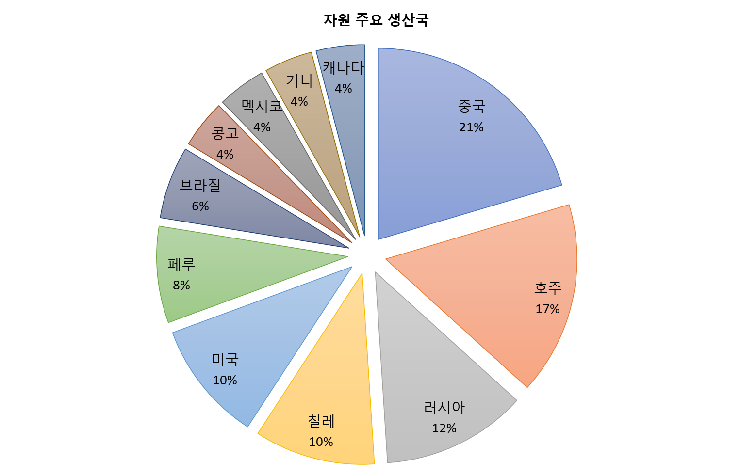 대부분 광산이라고 하면 한가지 물질만 나오지 않는다 여러 가지 원 소재가 나오는 것이다. 따라서 현재의 자원 주요 생산국은 앞으로도 계속 그 지위를 유지할 것으로 보인다. 미국이나 캐나다 아프리카 같은 경우는 내가 보기에는 전자는 환경오염 후자는 빈곤국이라는 이유로 개발이 잘 안 된 것으로 보이지 땅속의 자원은 많을 것으로 보인다.
